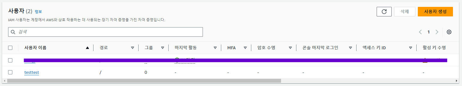 IAM -> 사용자 -> 사용자 이름(testtest) -> 보안 자격 증명 -> 액세스 키 만들기 버튼