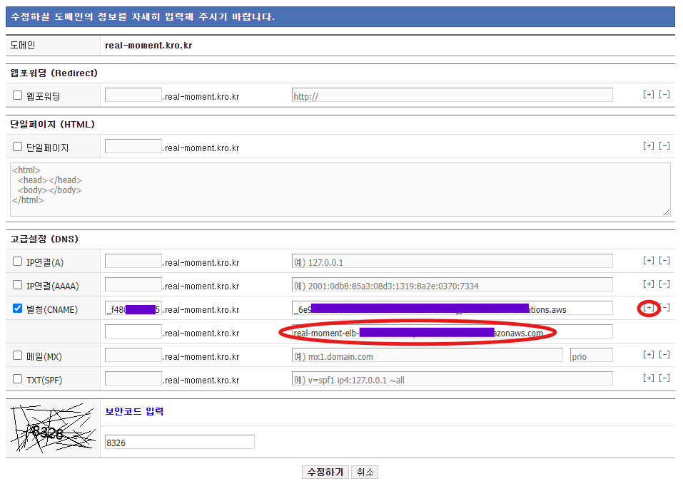 CNAME을 추가하여 연결될 ELB의 DNS 도메인을 적용하면 된다.