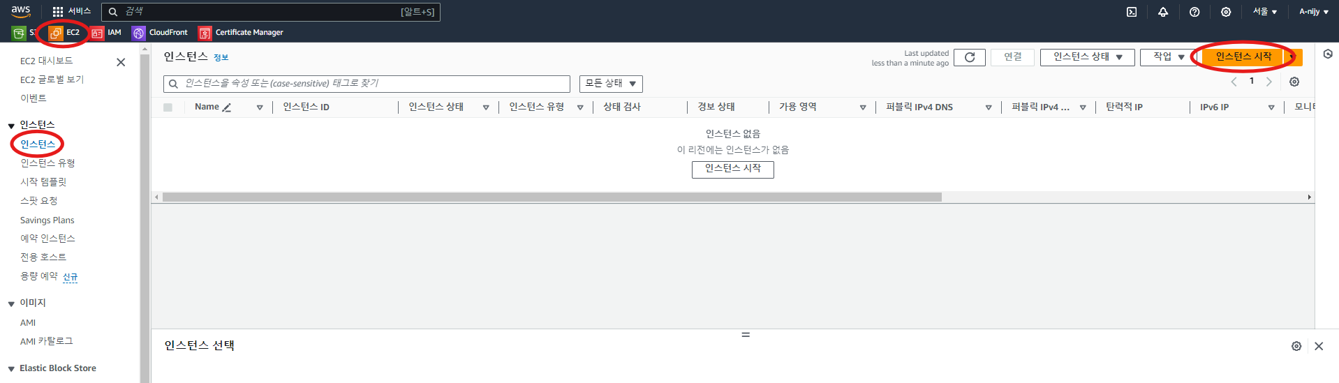 인스턴스 시작 버튼 위치