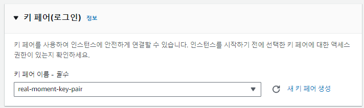 키 페어가 없다면 우측 "새 키 페어 생성"을 눌러 바로 생성 후 선택할 수 있다.
