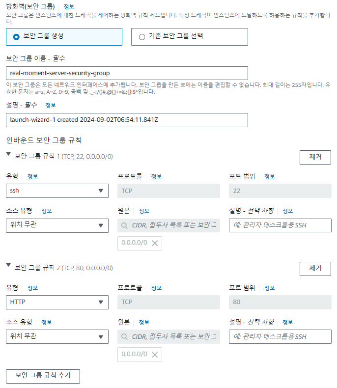 만약 사용할 보안 그룹이 이미 존재한다면 "기존 보안 그룹 선택"을 선택하여 원하는 보안 그룹을 지정하면 되고,