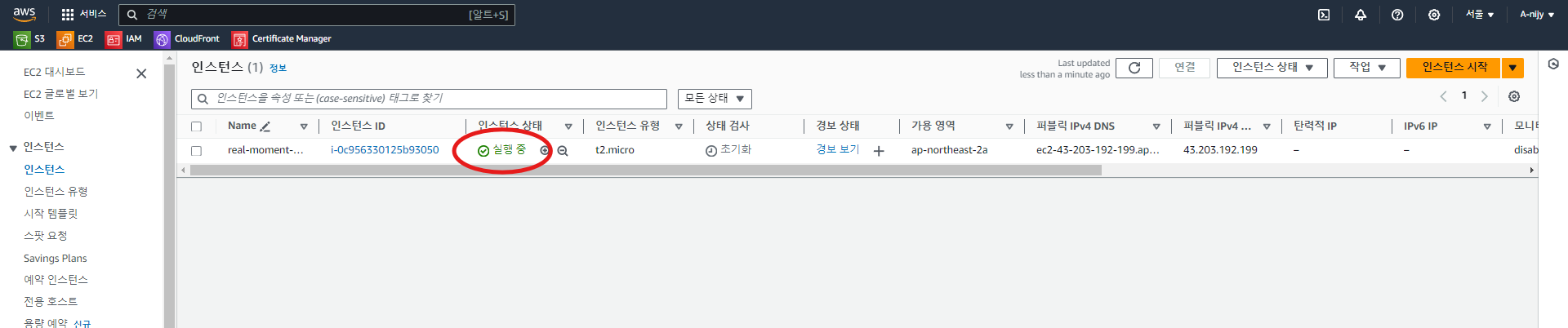 인스턴스 생성 후 조금 지나면 인스턴스 상태가 "실행 중"으로 변경된다.
