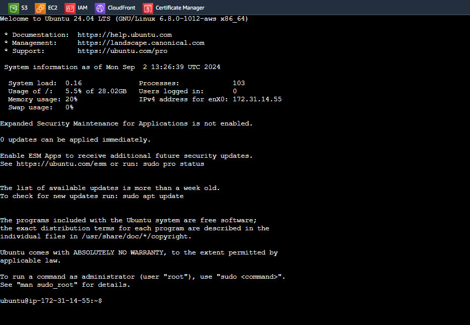 현재 Ubuntu OS 기반인 컴퓨터(인스턴스)를 원격으로 접속한 화면이다.