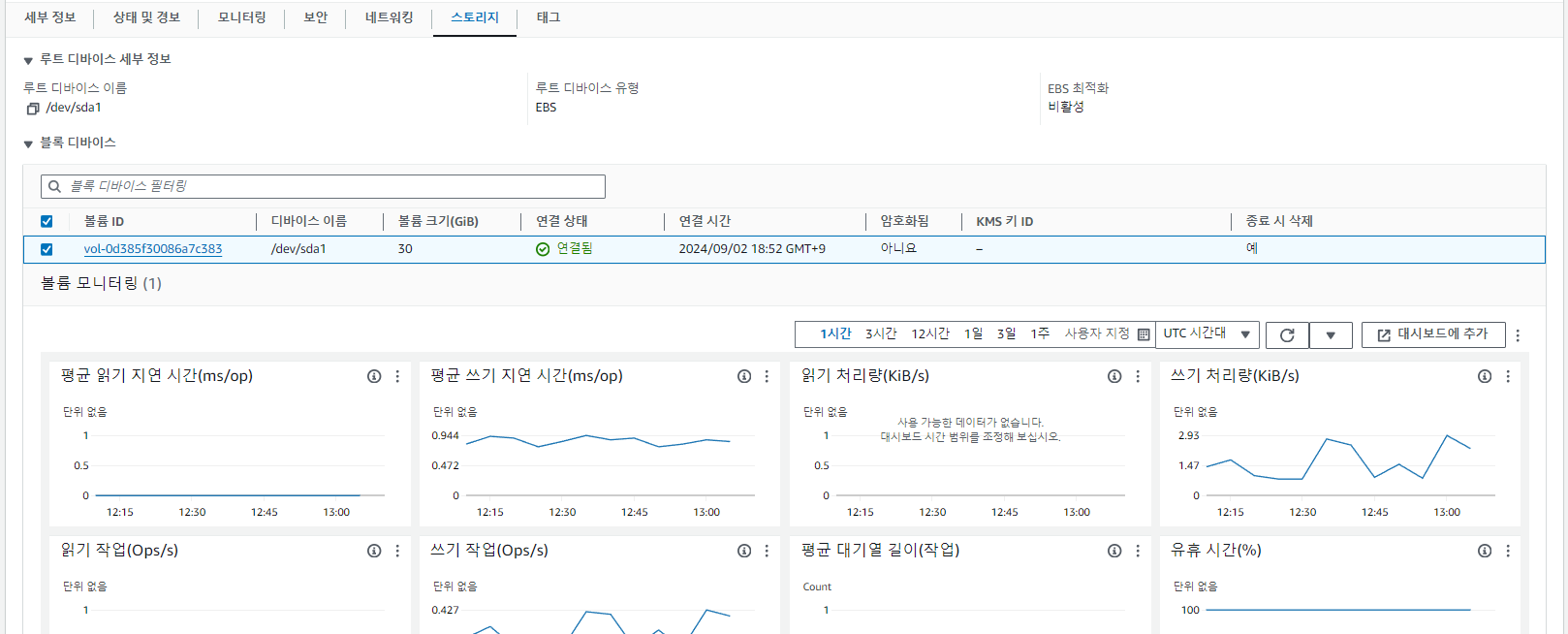 그리고 인스턴스의 성능들이 어떻게 사용되고 있는지, CPU는 얼마나 사용 중인지 등 지표들도 볼 수 있다.