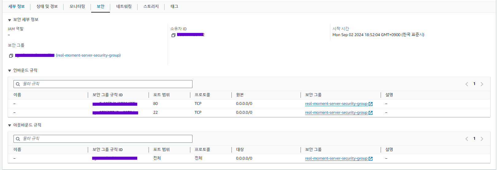 해당 인스턴스에 설정한 보안 정보(보안 그룹)들이 작성되어 있는 공간이다.