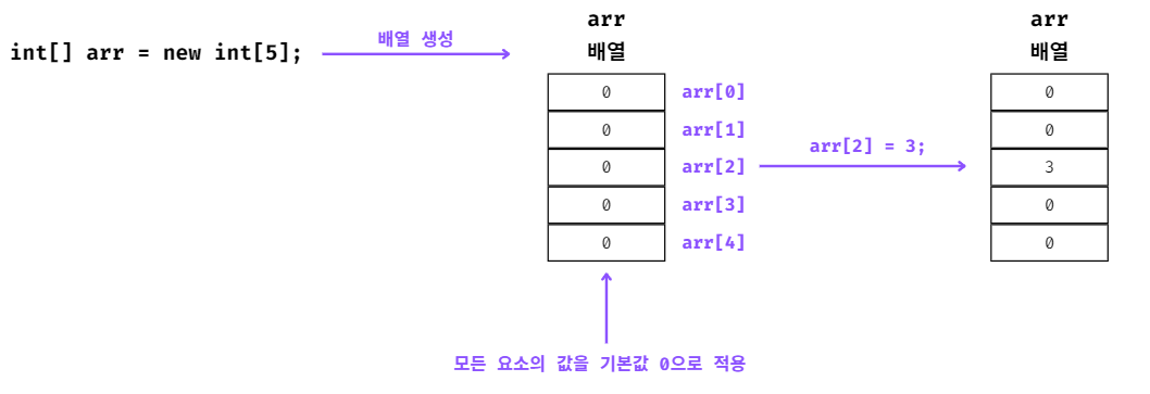 배열 생성 후 값을 할당(초기화) 하기 전에는 타입에 알맞은 기본값으로 설정된다.