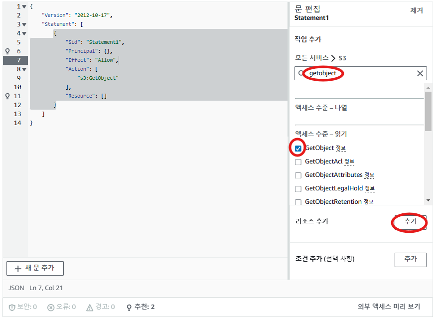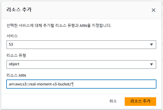 s3 검색 -> s3 선택 -> GetObject 선택 -> 리소스 추가 버튼