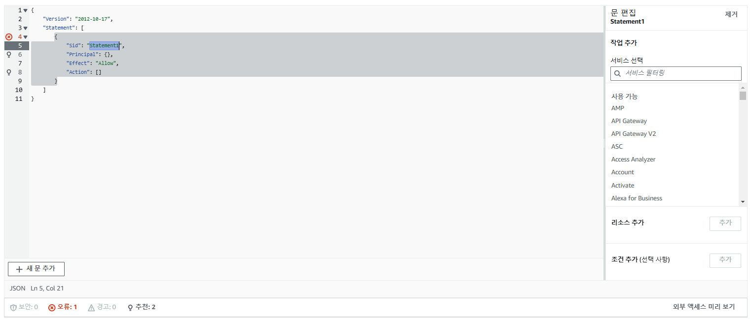 - "Sid" : Statement Id의 줄인말로 해당 정책을 고유하게 식별하기 위한 식별자다.