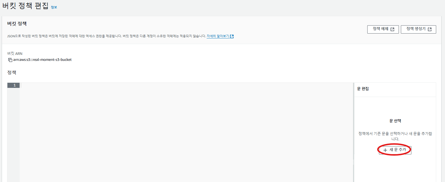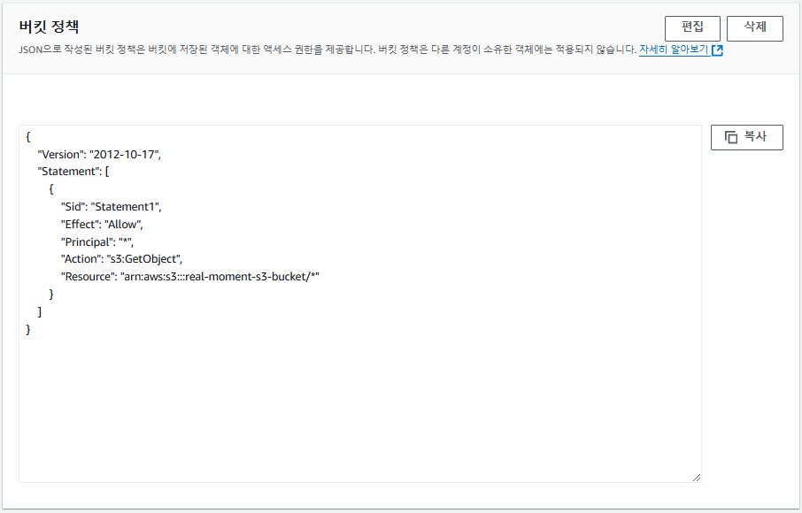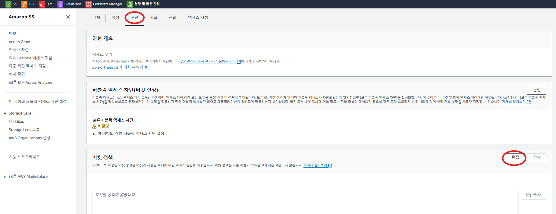 S3 -> 버킷 -> 정책 설정할 버킷 클릭