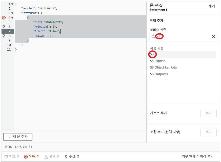 S3 버킷에 있는 객체를 조회하는 권한을 허용하는 JSON 코드