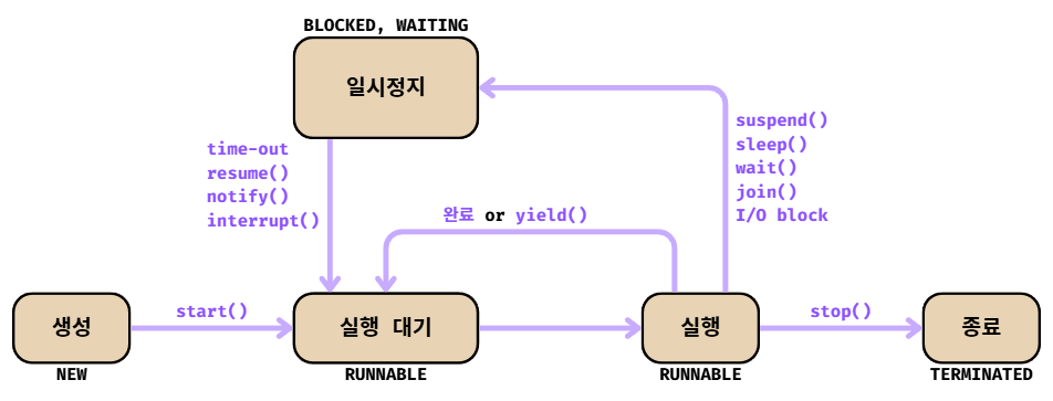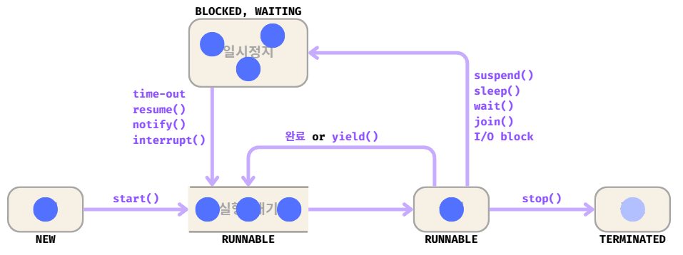 => 해당하는 특정 작업은 "일시정지"상태에서 빠져나와 다시 "실행대기"상태로 이동한다. - 모든 작업(실행)이 완료되거나 stop() 호출
