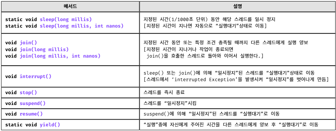 void resume() // suspend()에 의해 일시정지된 쓰레드를 실행대기상태로 만든다.