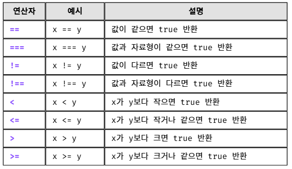 피연산자를 비교한 후 논리형 값인 참(true) 또는 거짓(false) 값을 반환하는 연산자