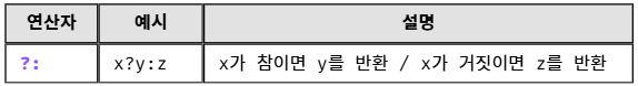 왼쪽에 있는 피연산자의 참(true)/거짓(false)에 따라 나머지 두항에 존재하는 피연산자를 선택하여 반환한다.